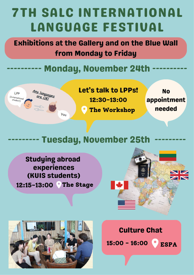Join us throughout the week to explore the rich linguistic and cultural diversity of the KUIS community! The SALC will host a variety of displays, special events focused on multilingual learning, and mini-language lessons led by KUIS students and teachers. You can also learn about study abroad opportunities through information provided by the Global Engagement and Partnership Division.