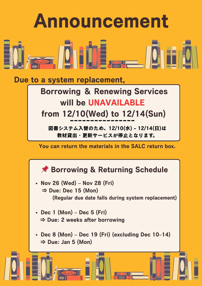 図書システム入替のため、12/10(水) – 12/14(日)は