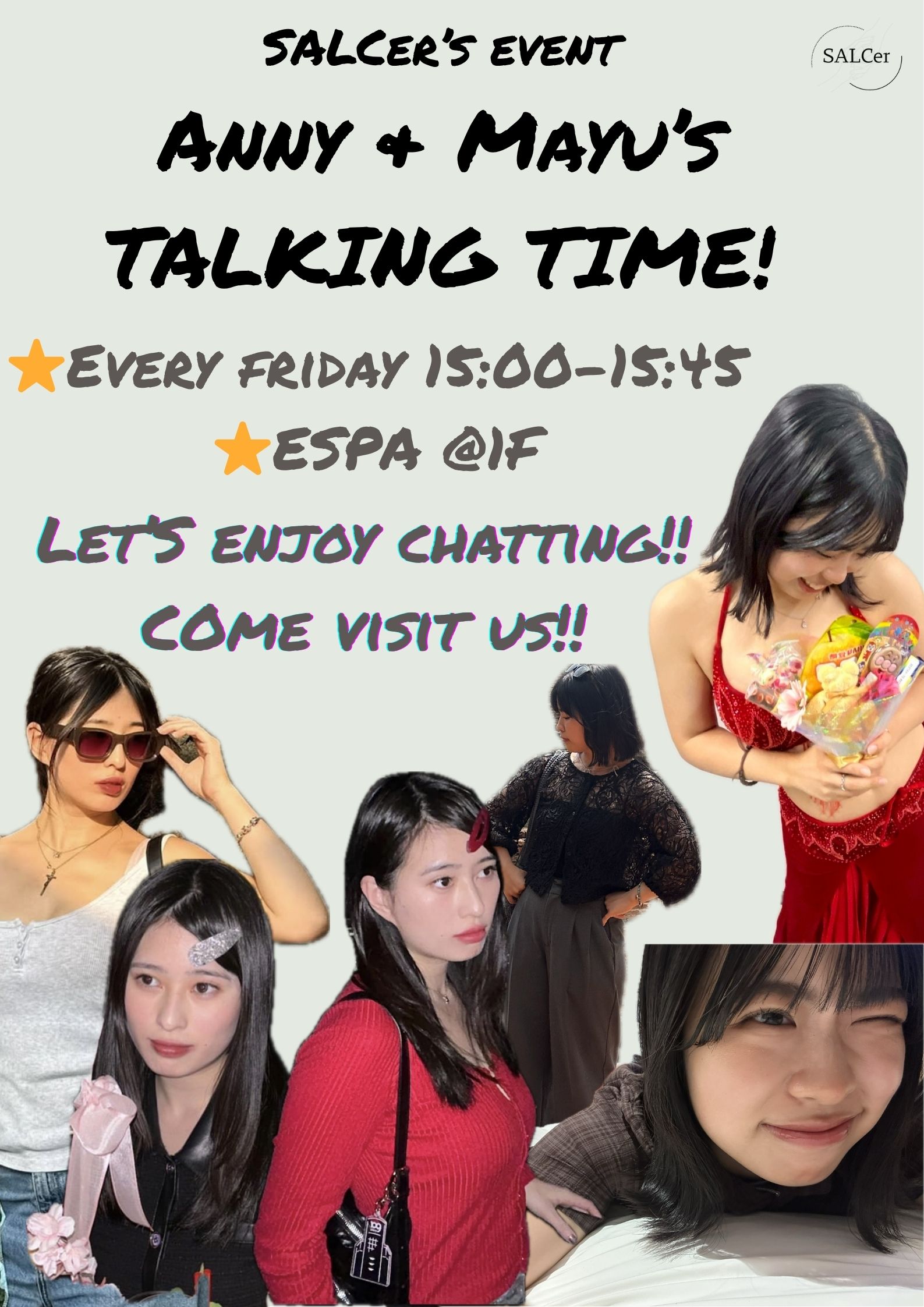 Enjoy casual chats with SALCers Anny and Mayu! SALCerと一緒におしゃべりしませんか? Feel free to come visit us! We are waitin.....Read more